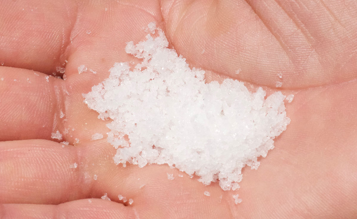 El grano de la flor de sal es delgado y blanco, casi como un copo (porque se forma en la superficie del agua).