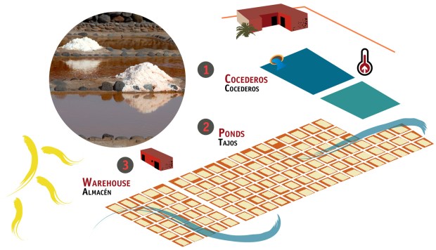 Seawater comes through the supply pipe to the first tank, “cocedero”. Here the material in suspension decanted and a portion of the water evaporates, increasing the water salinity. Then the water passes to a smaller tank. Thus 50% of the water evaporation and an increase of 7 times the original salinity is achieved. Water with higher temperature and more salt concentrated, pass to the ponds of 30/20 cm deep.